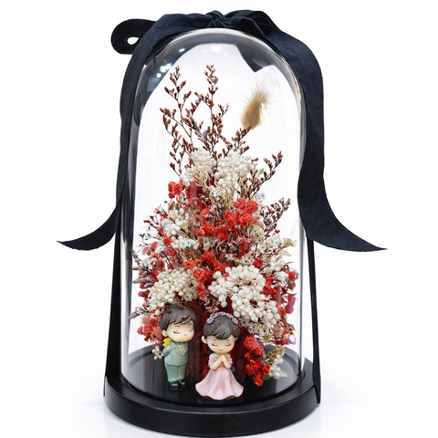 Handcrafted preserved flower arrangement in a glass dome with girl figurine, pastel florals, luxury gift decor on white background