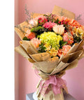 Give the gift of charm and creativity with our Blossom Bouquet in Newspaper Wrap, a beautifully curated mix of garden roses, green hydrangeas, chrysanthemums, alstroemerias, berries, and seasonal fillers.