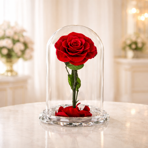 Decorative arrangement with white roses and a transparent bubble containing text in a modern living room.