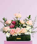 Soft, calming, and beautifully balanced — the Garden Serenity brings a touch of elegance to any space. This premium arrangement features a graceful blend of blush pink roses, white chrysanthemums, alstroemerias, and delicate fillers set in a modern dark-green floral box filled with natural moss.